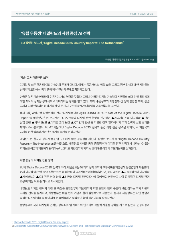 8월 22일 발행된 <최신해외동향>은 유럽연합 집행위원회의 ‘Digital Decade 2025 Country Reports: The Netherlands’를 바탕으로 작성했습니다. 네덜란드는 유럽의 디지털 혁신 선두 주자로, 안전하고 사람 중심적인 디지털 환경 조성을 핵심 목표로 삼고 있습니다. 중앙정부와 지방정부가 역할을 분담하고 협력하는 디지털 전략을 실행하고 있는데요. 한국과 정치·행정·산업 구조에서 많은 공통점이 있는 네덜란드 디지털 전환 사례를 통해 시사점을 살펴봅니다.