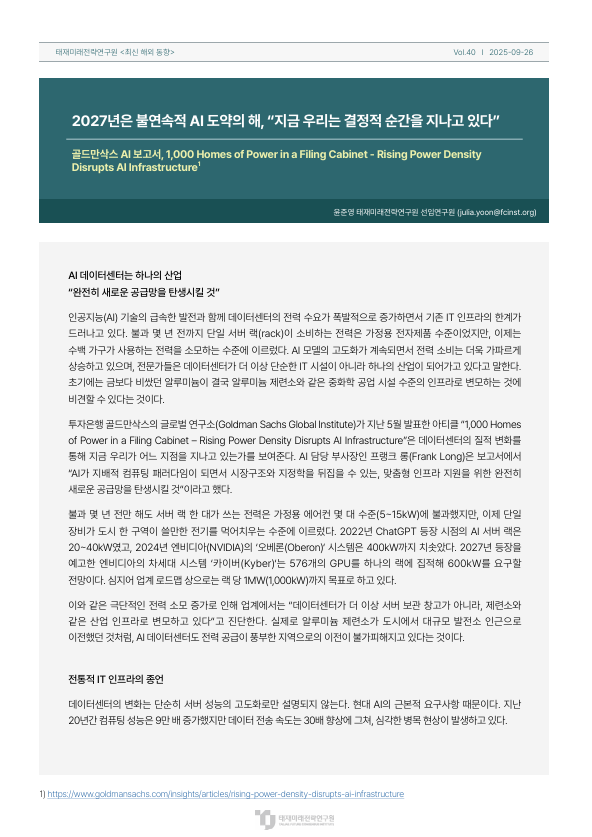 9월 26일 발행한 <최신해외동향>은 2025년 5월 골드만삭스 글로벌 연구소에서 발표한 아티클을 바탕으로 작성되었습니다. AI 데이터센터가 단순한 서버 보관소가 아니라 전력과 냉각을 기반으로 한 거대한 산업 인프라로 변화하는 모습을 보여줍니다. 이를 통해 현재 우리가 AI 발전의 어느 지점을 지나고 있는가를 가늠할 수 있습니다. 각국은 '데이터센터가 곧 에너지 인프라'라는 인식 아래, AI 데이터센터를 정책적으로 구체화하고 있습니다.