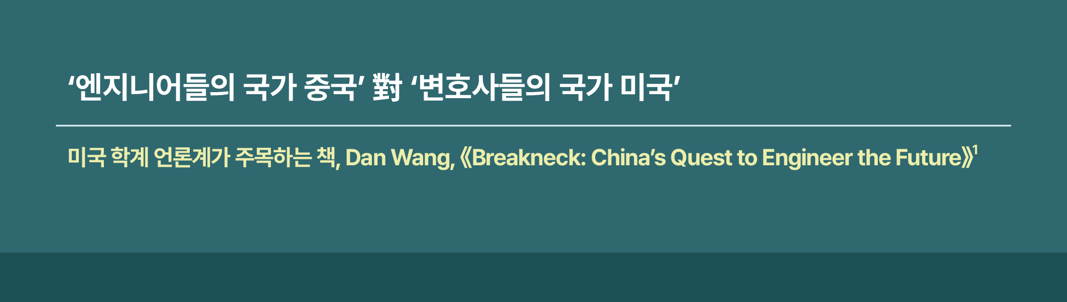 Dan Wang, Breakneck: China’s Quest to Engineer the Future 지금 미국에선 지난 8월 중국계 캐나다인 ‘댄 왕’이 쓴 책 ‘돌진(Breakneck): 미래를 건설하려는 중국의 탐색’이 화제다. 미국과 중국 사회의 어떤 본질적 차이를 건드렸다고 보는 것 같다. 책은 중국을 ‘엔지니어들의 국가이면서 레닌주의 국가’로, 미국을 ‘법률가와 변호사들이 주도하는 장벽의 나라’라고 규정한다. 양 극단에 해당하며 서로의 거울이라고 한다. 앞으로 두 나라가 어떤 거버넌스, 어떤 정치 시스템을 만드느냐가 경쟁의 승패를 가를 것이라고 본다. |