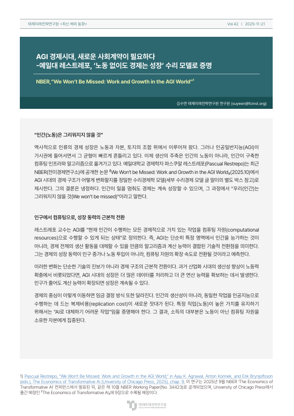 11월 21일 발행된 <최신해외동향>은 2025년 10월 공개된 논문 'We Won’t be Missed: Work and Growth in the AGI World'를 바탕으로 작성되었습니다. 예일대 레스트레포 교수는 인공일반지능(AGI) 시대 경제 구조의 변화를 수리경제학 모델로 분석하며, 성장 동력이 인간의 노동에서 컴퓨팅 자원의 확장 속도로 이동할 것이라고 전망합니다. 또한 AGI 전환이 '점진적 적응'과 '급격한 붕괴' 두 경로로 나타날 수 있다고 제시합니다. 두 가지 AGI 전환 시나리오 중 한국은 과연 어느 길을 걷게 될까요? 자세한 내용은 <최신해외동향> 원문을 확인해 주세요.